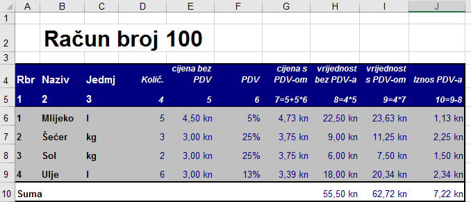 stupca A. Zaglavlje (prvi redak): Rbr. Upiši u polje A2