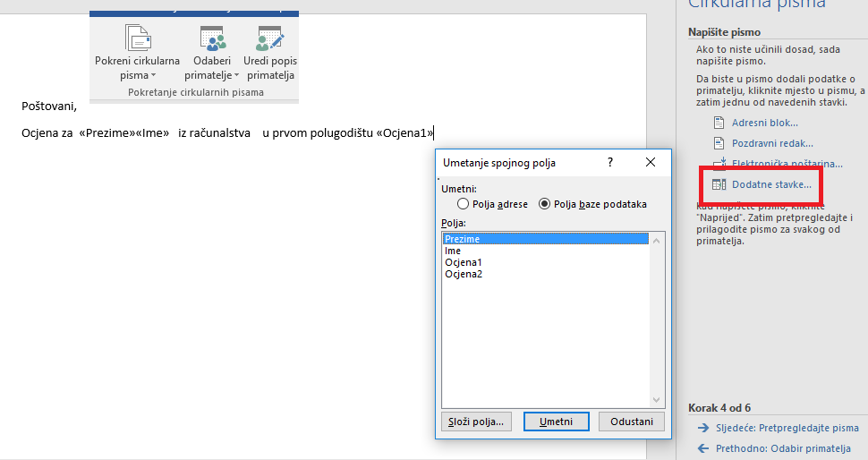 Na mjestima << >> umetni spojna polja iz popisa primatelja (klik na